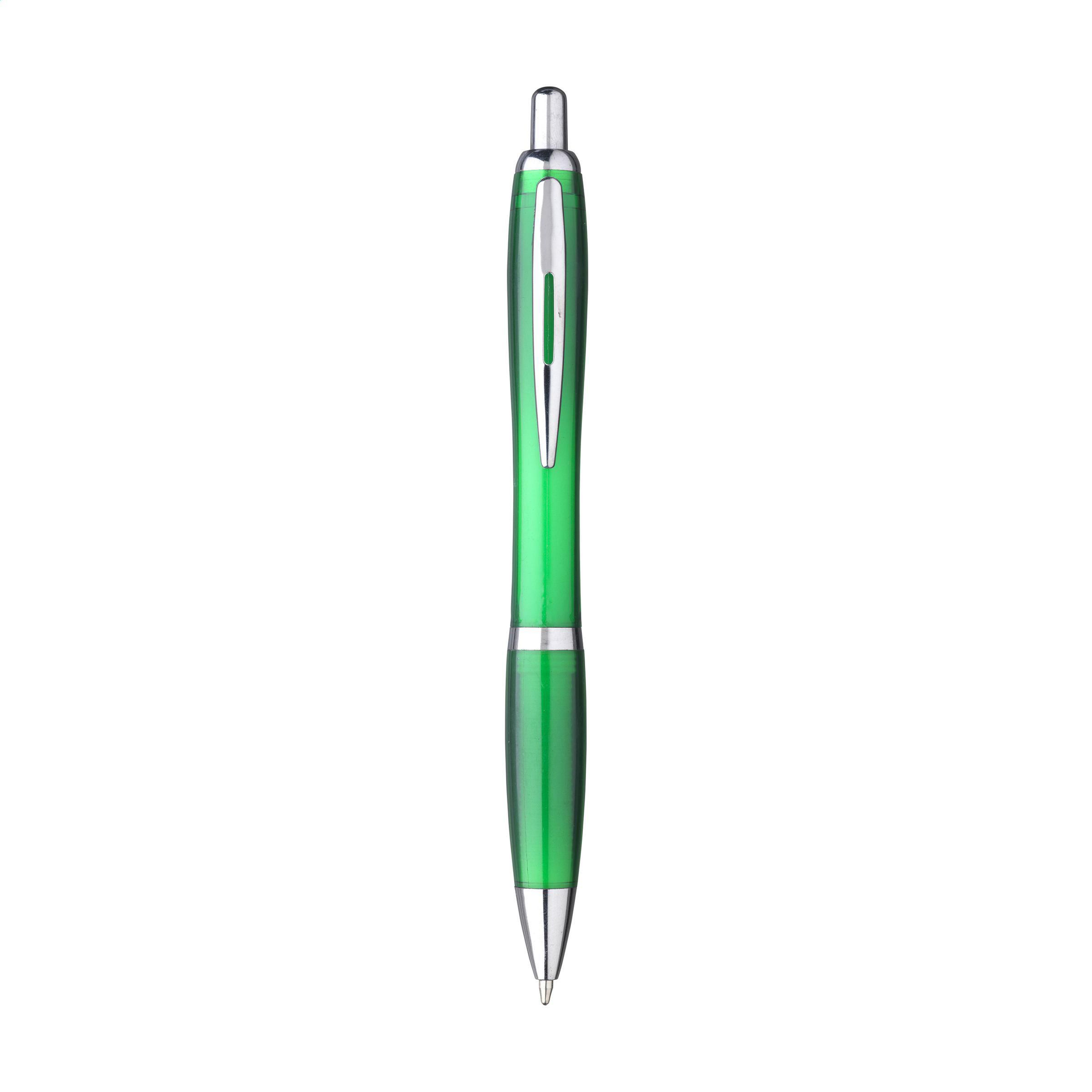 Stylo à bille à encre bleue avec un corps de couleur transparente, fabriqué en PET 100% recyclé. Avec un aspect très brillant et un clip en métal.