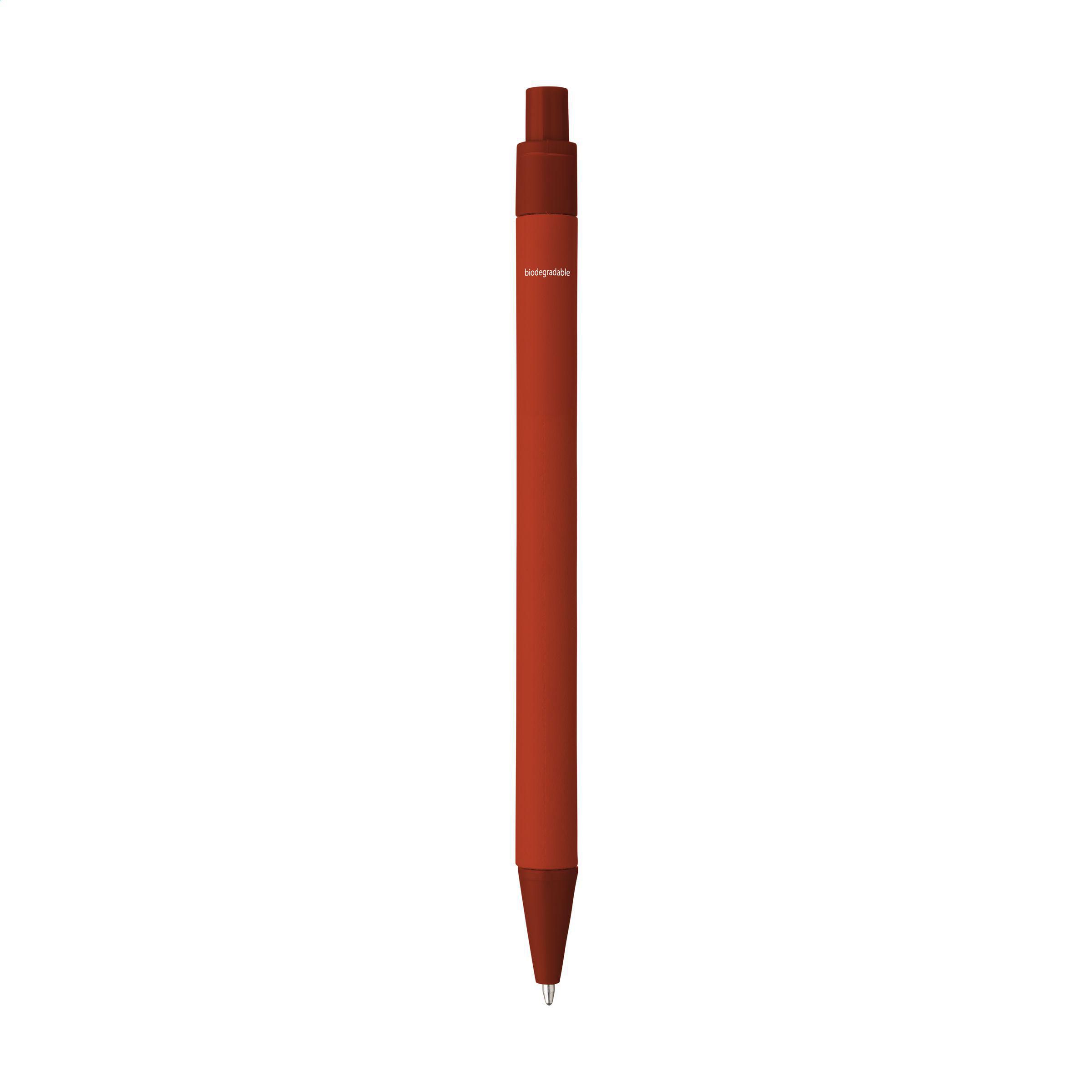 Stylo à bille à encre bleue en papier recyclé. Le clip, le bouton-poussoir et la pointe sont en PLA biodégradable.