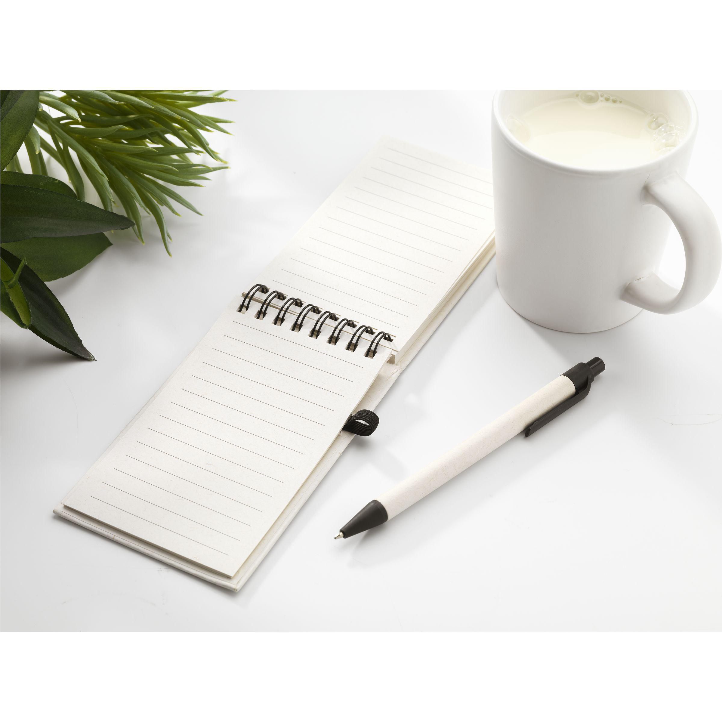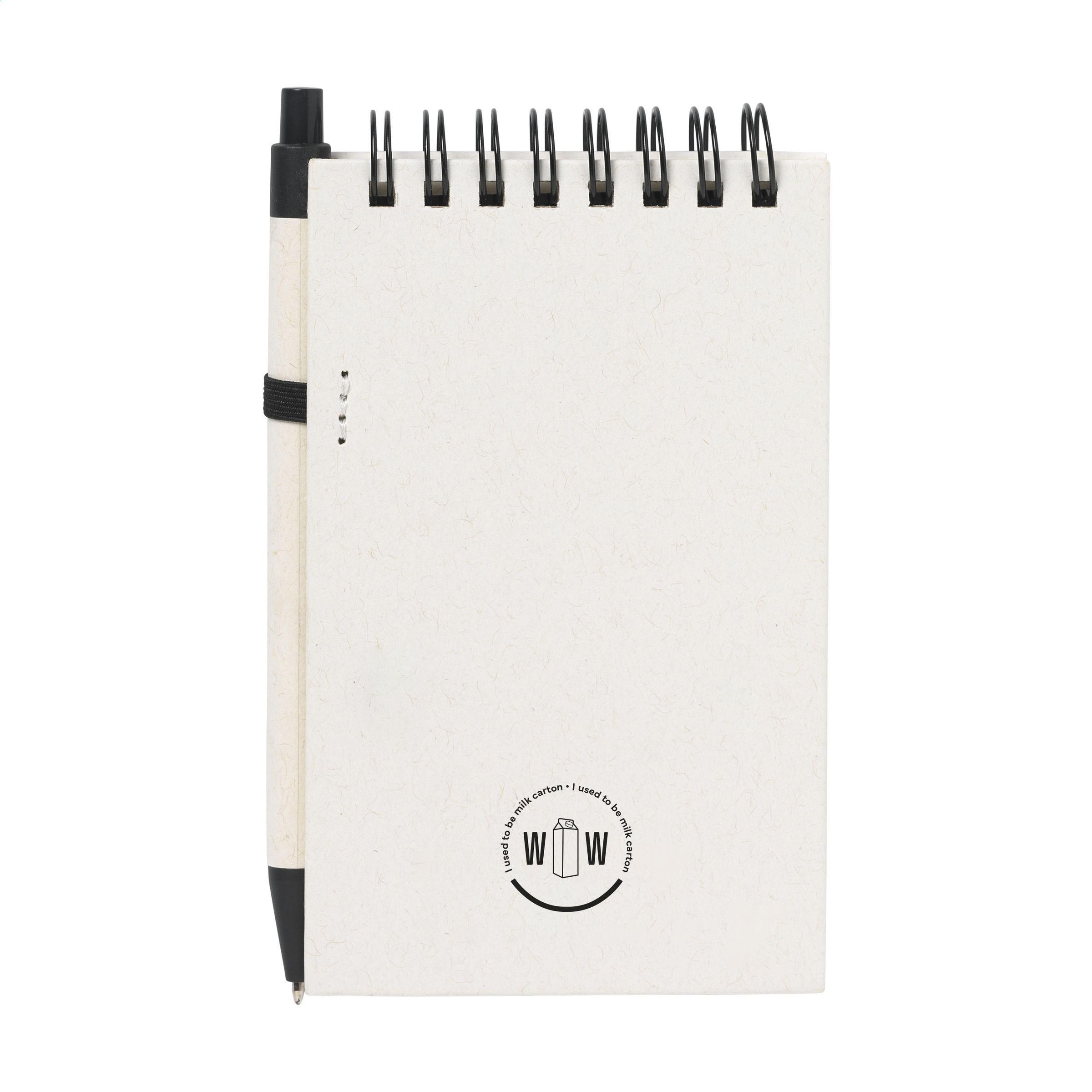 1. DETAILS DU PRODUITCarnet A6 dont la couverture et le papier sont fabriqués à partir de restes de papier provenant de briques de lait recyclées (jusqu'à 70%) et de 30% de papier recyclé. Le carnet est relié à spirale et compte environ 70 feuilles/140 pages de papier ligné recyclé de couleur crème (80 g/m²). Il est livré avec un stylo à bille à encre bleue assorti, fabriqué à partir de briques de lait recyclées. En raison de l'utilisation de matériaux recyclés, petites imperfections dans le matériau peuvent être visibles. Cela confère au produit un aspect unique. |