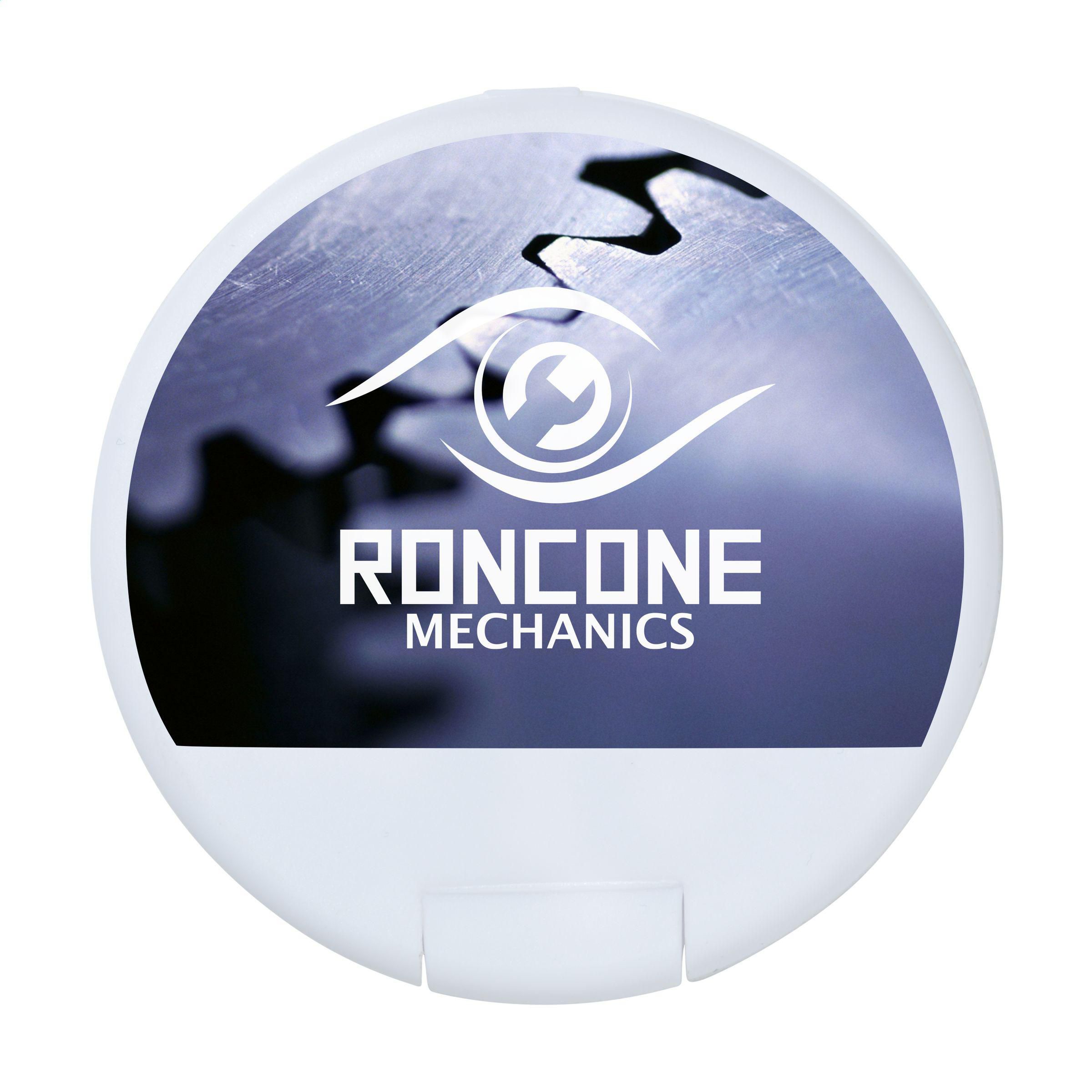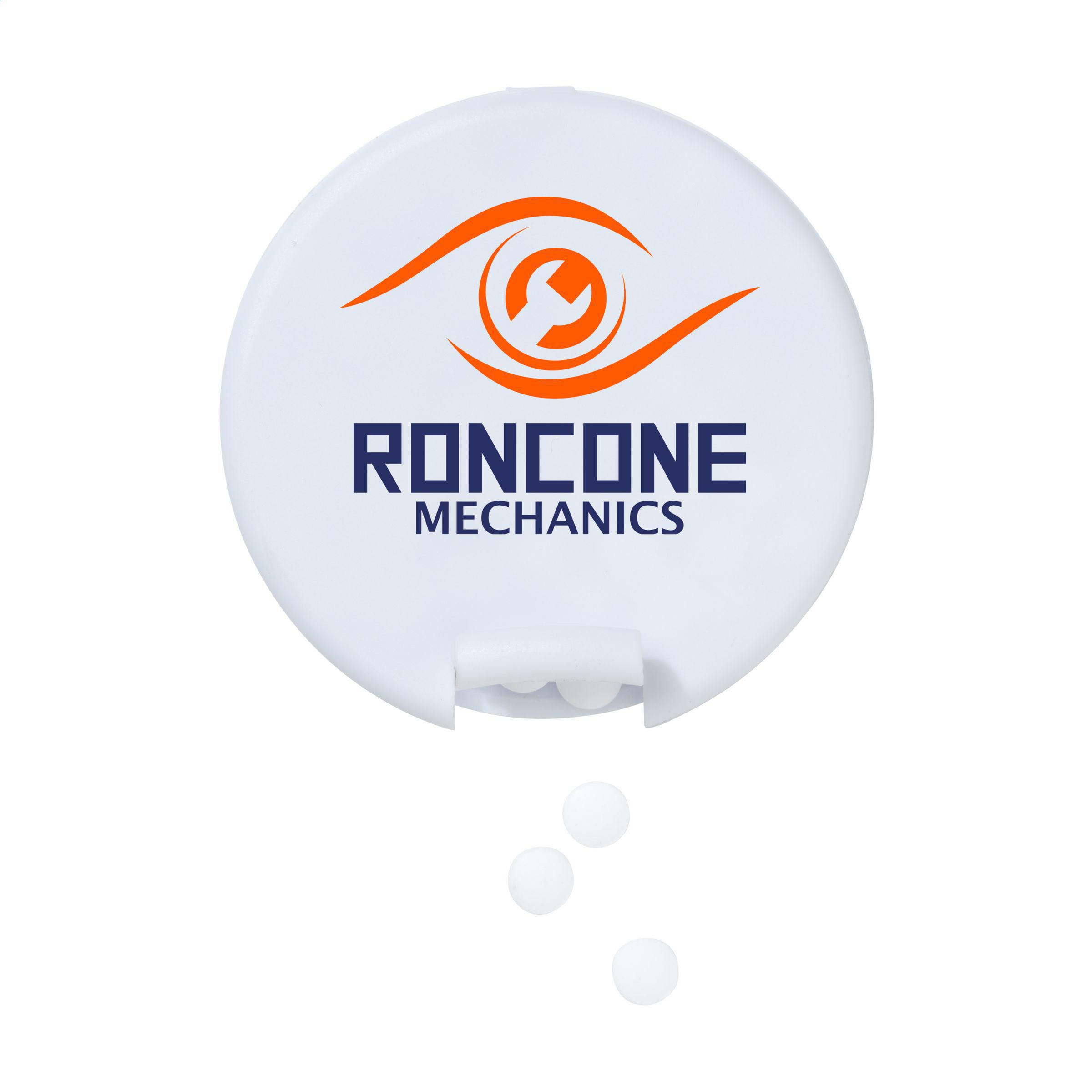 Boîte distributrice en plastique rond rempli d'environ 12 g (55 pcs) de bonbons sans sucre à la menthe.