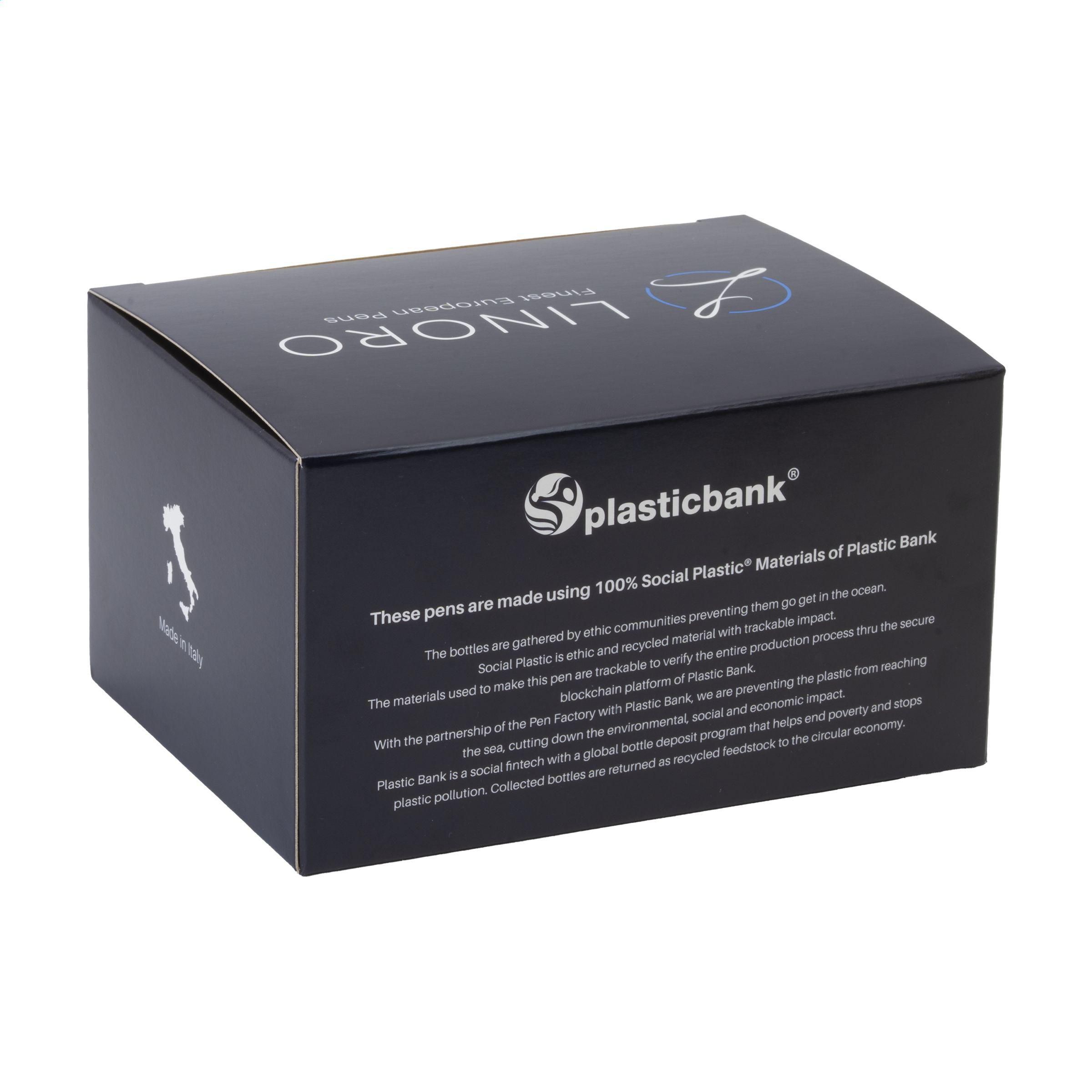 1. DETAILS DU PRODUITStylo à bille à encre bleue de la marque Linoro. Fabriqué à partir de plastique recyclé Ocean Bound Plastic de Plastic Bank®. Le stylo à bille est doté d'un large corps du stylo mat et d'un bouton-poussoir brillant avec clip intégré. Le clip généreux et le corps large et solide offrent beaucoup d'espace pour une impression remarquable. Fabriqué en Italie. |
