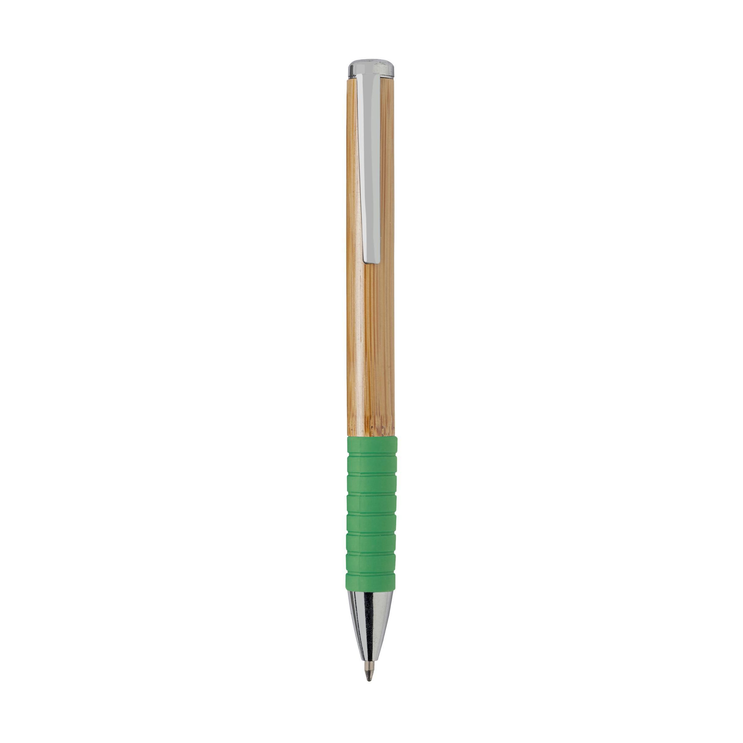 Stylo à bille à encre bleue avec corps en bambou, clip métallique, système à cliquet rotatif et embout en caoutchouc coloré.