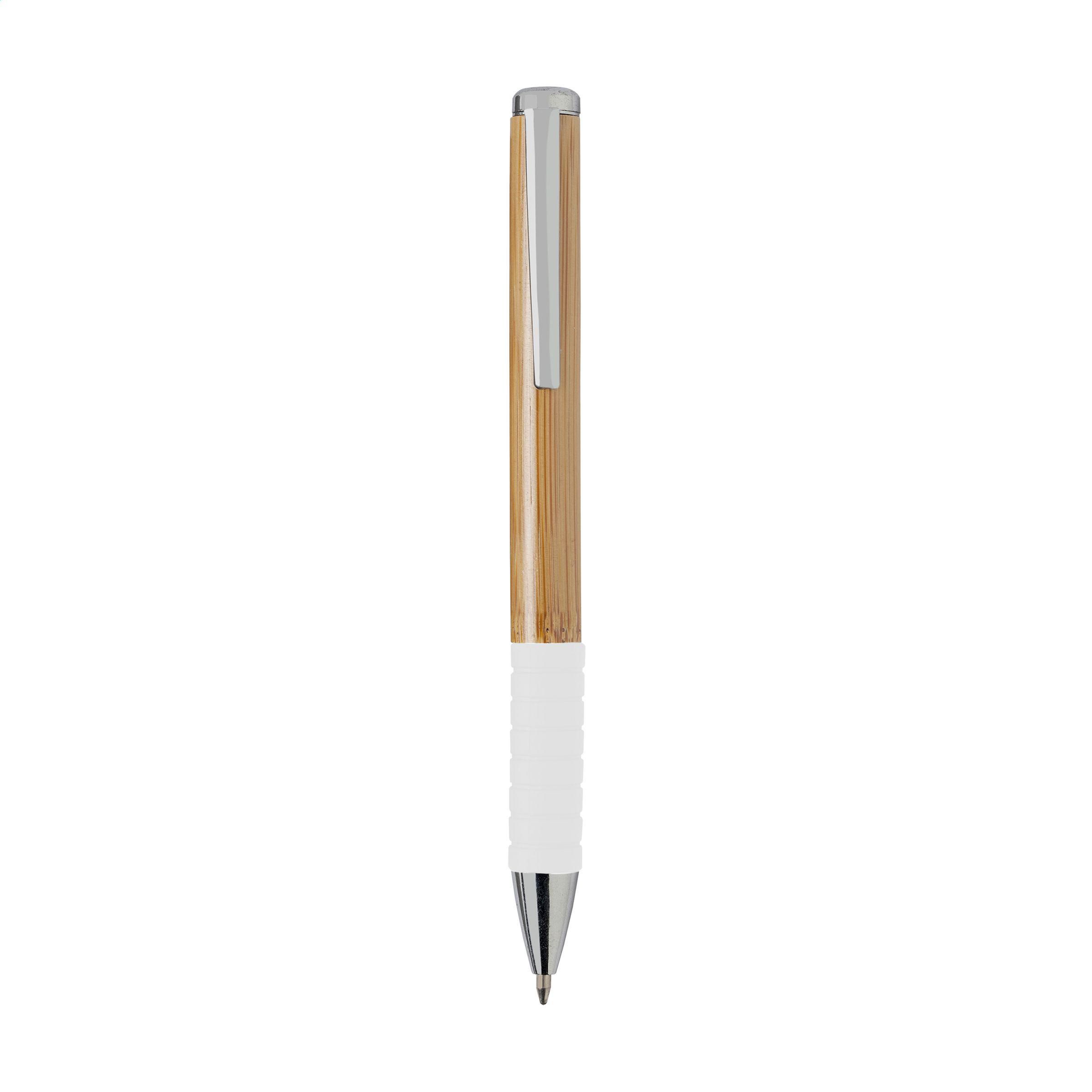 1. DETAILS DU PRODUITStylo à bille à encre bleue avec corps en bambou, clip métallique, système à cliquet rotatif et embout en caoutchouc coloré. |