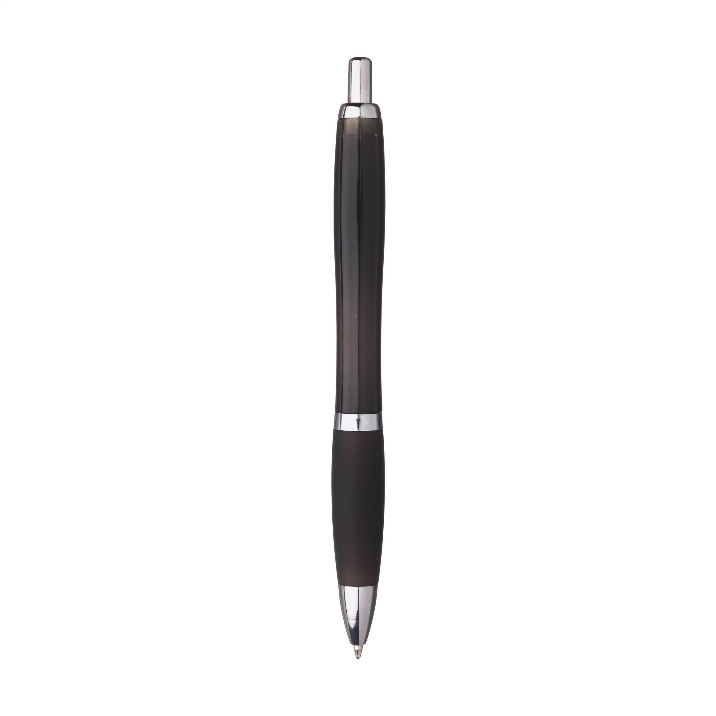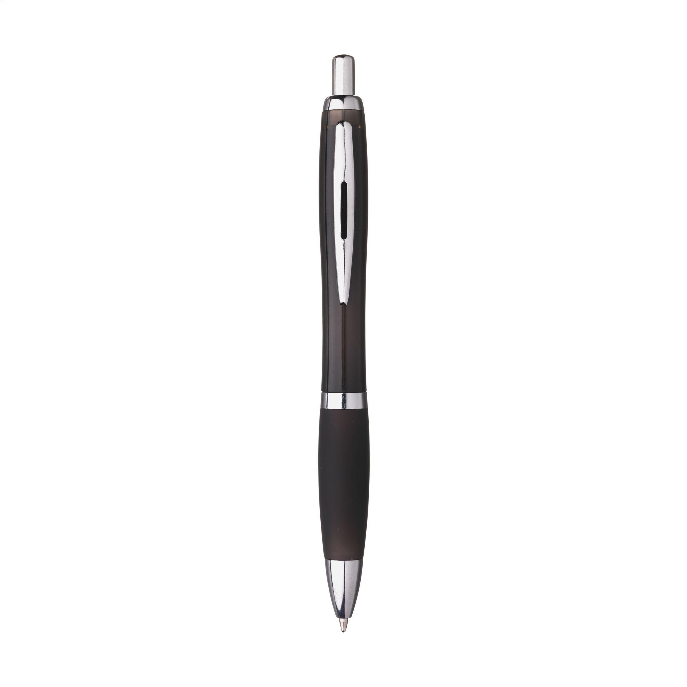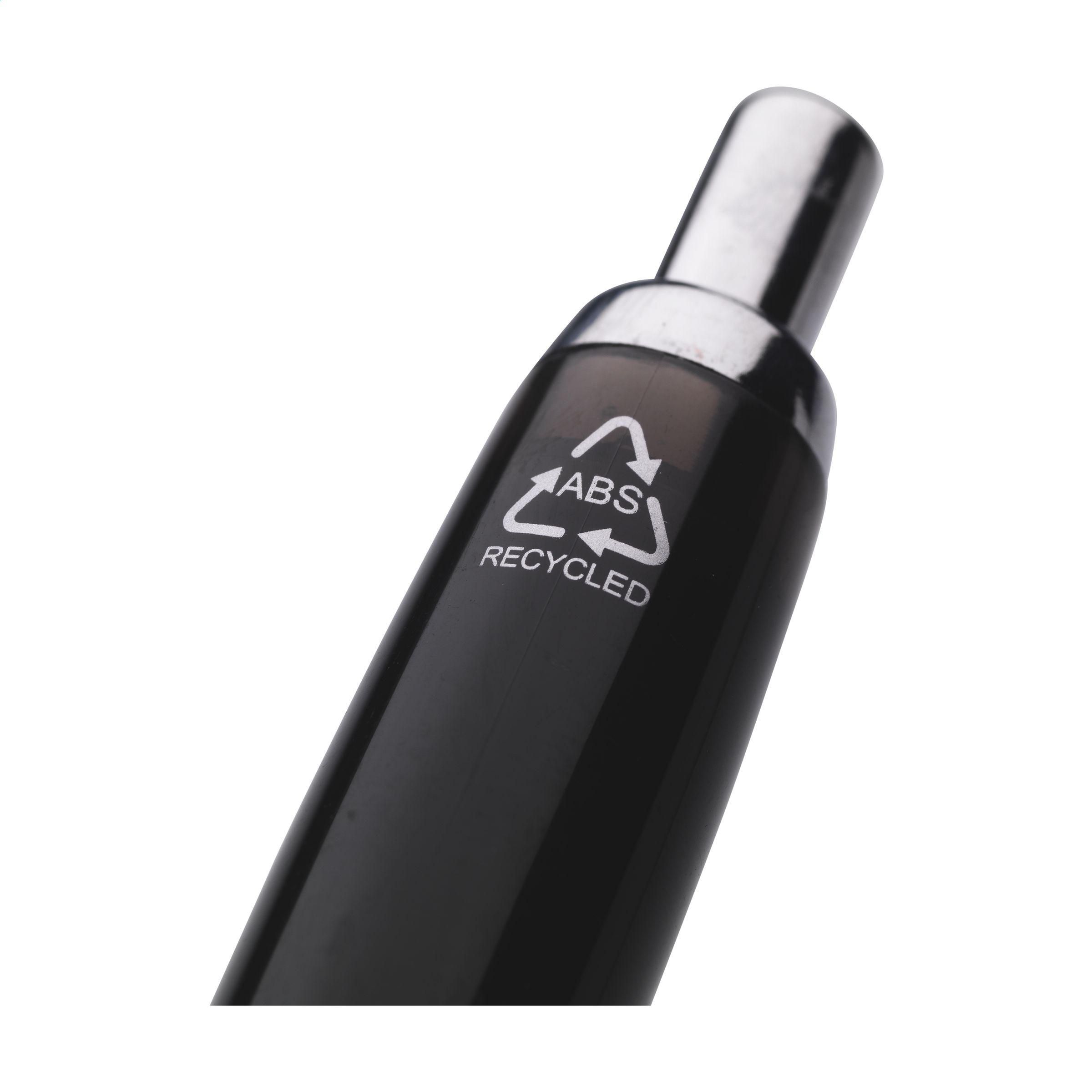 Stylo à encre bleue. Le corps solide est en ABS recyclé. Avec bouton-poussoir, clip en métal et accents argentés. Certifié RCS. Matière recyclée totale : 78%.