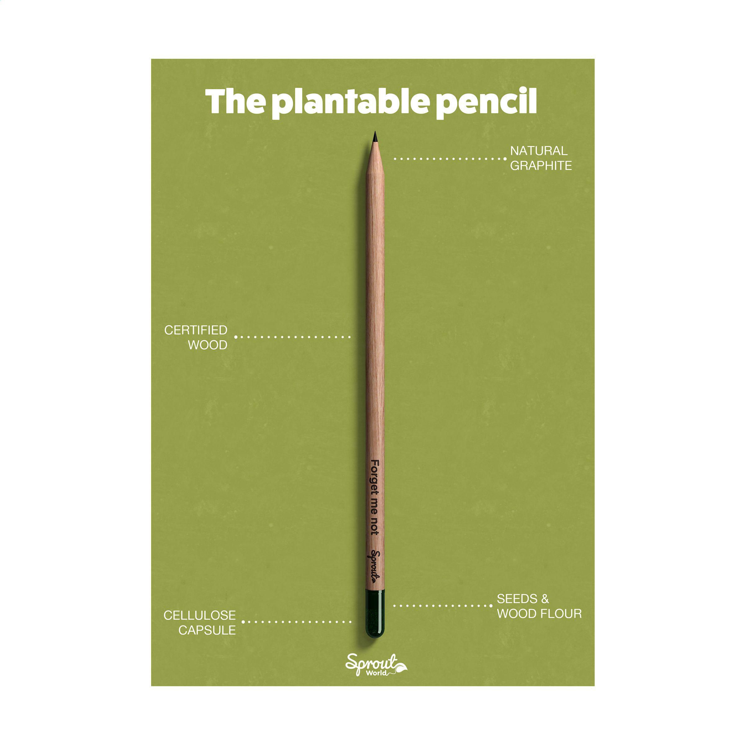 Crayon Sproutworld avec un message inspirant pour la nature. Ce crayon à la pointe aiguisée est en bois. À son extrémité se trouve une capsule (en cellulose) qui contient des graines. Une fois que le crayon est devenu trop petit pour écrire avec, plantez-le avec la capsule dans un peu de terre. Après 2-3 semaines, les graines commencent à germer et se transforment en jolies fleur, en herbes aromatiques ou en des légumes parfumés. Choisissez parmi différents types. Le nom de la plante choisie sera gravé sur le crayon. Le crayon ne contient pas de plomb et est donc totalement sûr. Fabriqué en Europe. Article complémentaire W387 : Carte en carton coloré dans laquelle le crayon peut être inséré. La carte contient des informations en anglais sur le produit. Cette carte confère au produit une valeur d'attention exclusive.Une évaluation du cycle de vie (LCA) de ce produit est disponible dans les téléchargements. Sproutworld est certifiée B Corp ; la collection est produite selon les normes écologiques et sociales B Corp les plus élevées possibles.