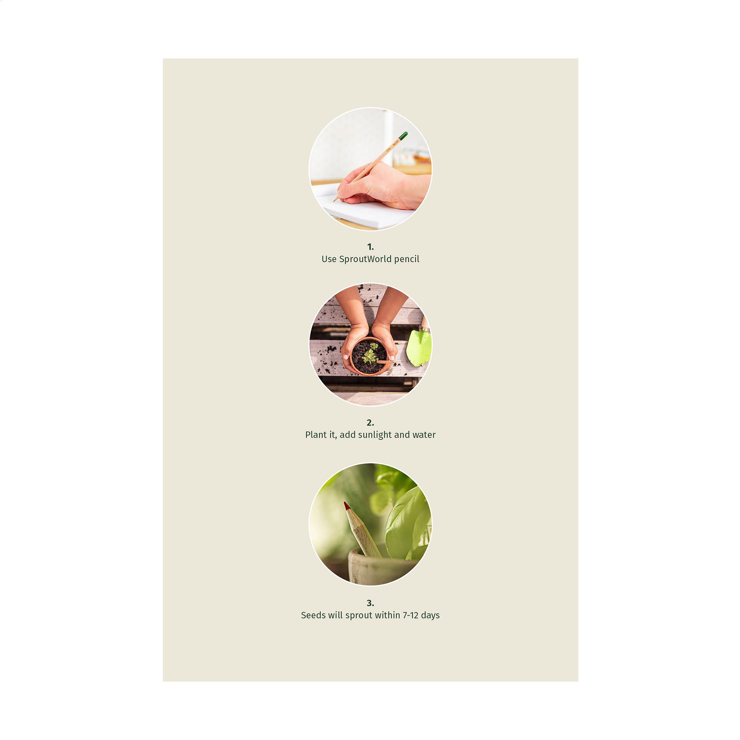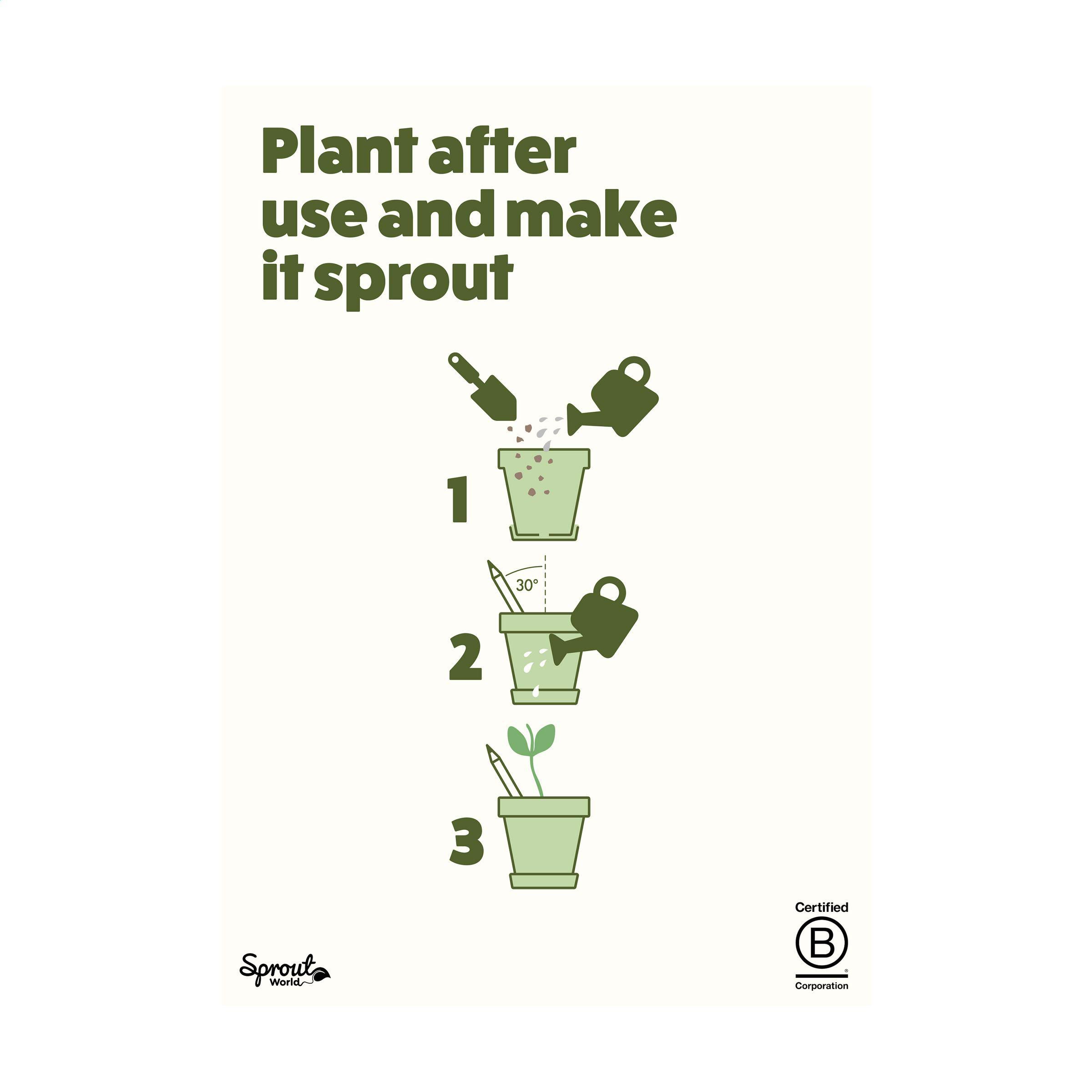 1. DETAILS DU PRODUITCrayon Sproutworld avec un message inspirant pour la nature. Ce crayon à la pointe aiguisée est en bois. À son extrémité se trouve une capsule (en cellulose) qui contient des graines. Une fois que le crayon est devenu trop petit pour écrire avec, plantez-le avec la capsule dans un peu de terre. Après 2-3 semaines, les graines commencent à germer et se transforment en jolies fleur, en herbes aromatiques ou en des légumes parfumés. Choisissez parmi différents types. Le nom de la plante choisie sera gravé sur le crayon. Le crayon ne contient pas de plomb et est donc totalement sûr. Fabriqué en Europe. Article complémentaire W387 : Carte en carton coloré dans laquelle le crayon peut être inséré. La carte contient des informations en anglais sur le produit. Cette carte confère au produit une valeur d'attention exclusive.Une évaluation du cycle de vie (LCA) de ce produit est disponible dans les téléchargements. Sproutworld est certifiée B Corp ; la collection est produite selon les normes écologiques et sociales B Corp les plus élevées possibles. |